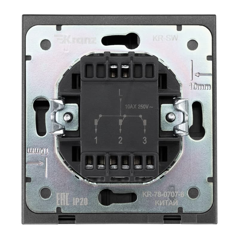 Механизм трехклавишного выключателя скрытой установки KRANZ предназначен для включения и выключения одного, двух или трех однофазных потребителей в электрических сетях переменного тока. Благодаря лаконичной форме корпуса и благородному цвету графит устройство гармонично дополнит любой интерьер.Сечение проводников составляет 1,5-2,5 мм².
