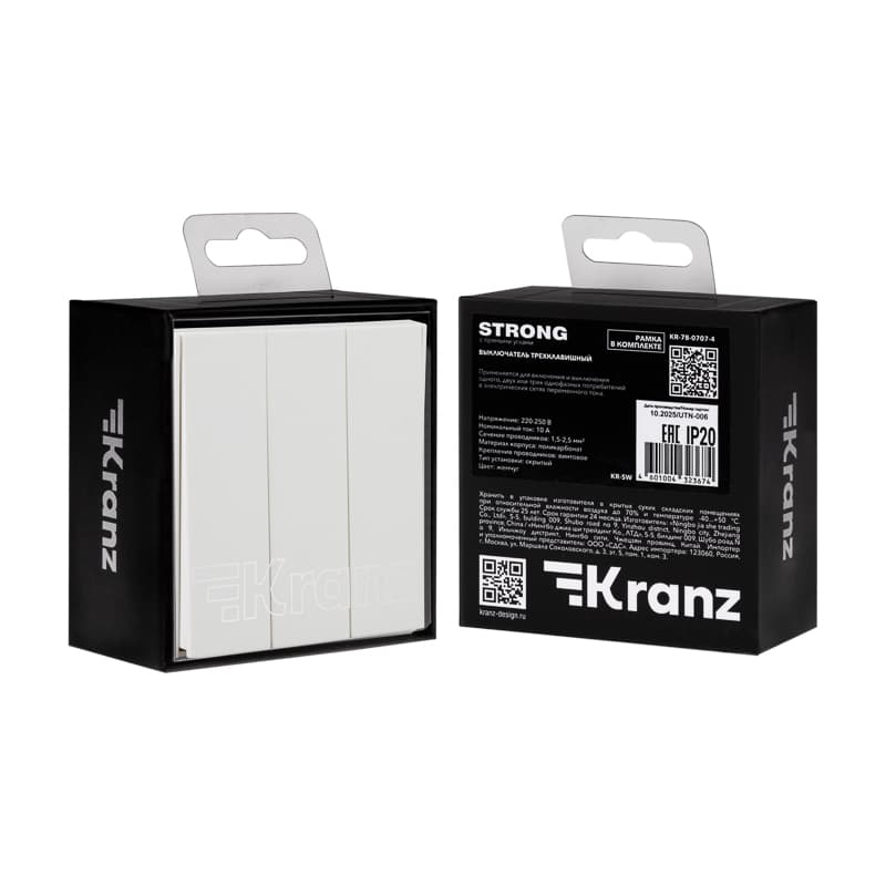 Механизм трехклавишного выключателя скрытой установки KRANZ предназначен для включения и выключения одного, двух или трех однофазных потребителей в электрических сетях переменного тока. Благодаря лаконичной форме корпуса и белому цвету устройство гармонично дополнит любой интерьер.Сечение проводников составляет 1,5-2,5 мм².